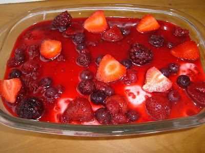 Caldinha de frutas vermelhas: dissolva o açúcar na água e coloque para ferver, assim que formar bolhas bem grandes adicione as frutas e deixe cozinhar por mais alguns minutos. Desligue o fogo e deixe esfriar bem.